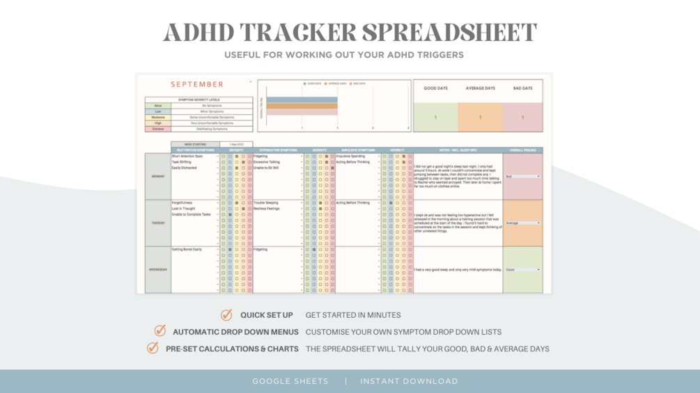 [ADHD Tracker Template, Symptom Tracker, Google Sheets Tracker, Symptom Journal, Mental Health Log, ADHD Monitoring, Diary, Trigger Tracking, Therapy Worksheet, Google Sheets Health Tracker, ADHD Management Tool, ADHD Tracker Spreadsheet, Adult ADHD Journal, Daily ADHD Symptoms Tracker, Mental Health Care Tools, Google Sheets ADHD Log, Therapy Tools for ADHD, ADHD Self-Care Planner, ADHD Management Template, Focus and Productivity Tracker, Cognitive Behavioral Therapy for ADHD]